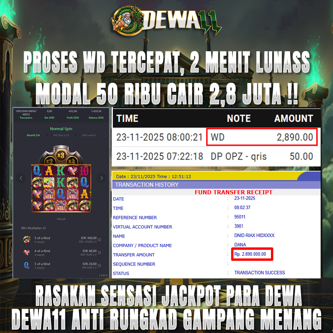 Gabung bersama DEWA11 dan Dapatkan kesempatan jackpot sensasional dalam 15 menit seperti bukti banner ini bukan sekedar janji hanya Depo 50k Withdraw 2,8+ juta hari ini.
